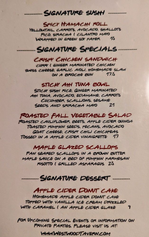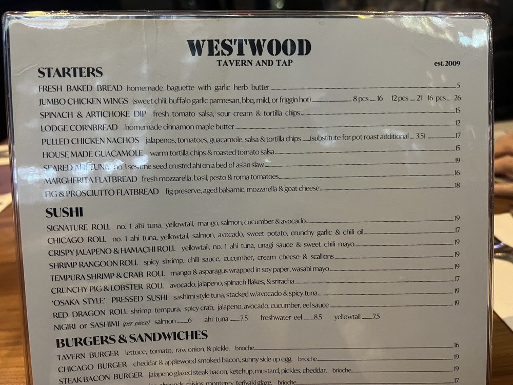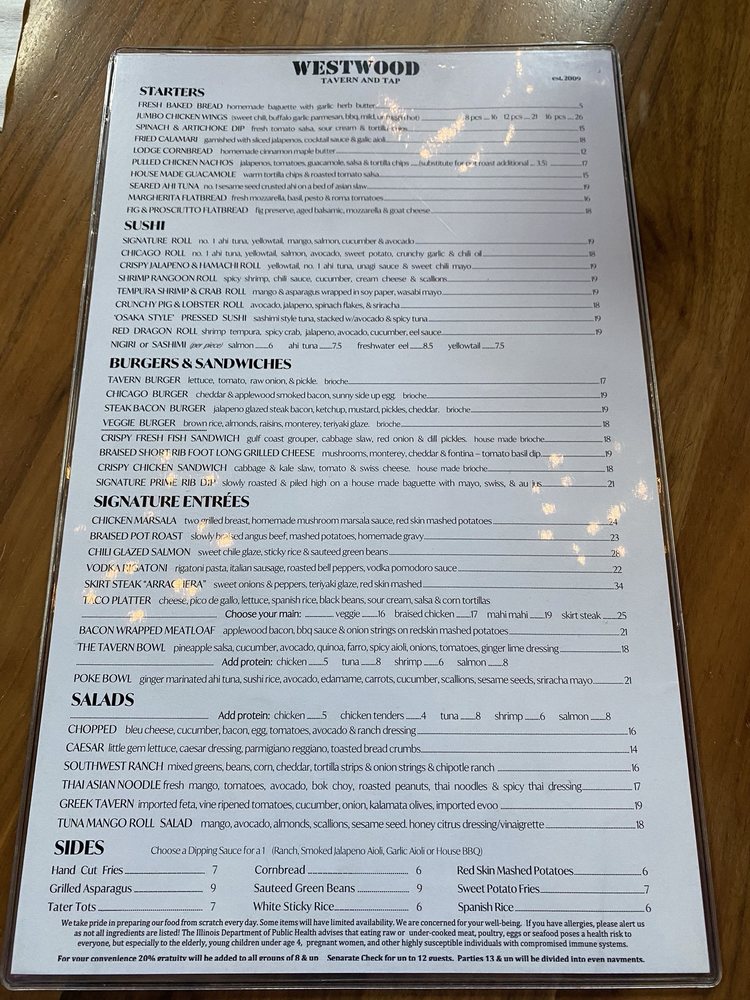 Introducing the menu at Westwood Tavern, a New American Bar in Schaumburg, IL, offers a diverse range of options for all diners. Start with the mouthwatering Fresh Baked Bread with Garlic Herb Butter or indulge in the flavorful Jumbo Chicken Wings in various sauces. Satisfy your sushi cravings with rolls like the Signature Roll with Ahi Tuna, Yellowtail, and Mango. For burger enthusiasts, the Tavern Burger and Chicago Burger are sure to impress. Customer reviews highlight the generous portions, attentive staff, and delicious dishes like the Crispy Fish Sandwich. With options for vegans, vegetarians, and meat lovers alike, Westwood Tavern is the perfect spot for a casual night out with friends or family. Don't miss out on their Happy Hour specials and outdoor seating for a great dining experience.